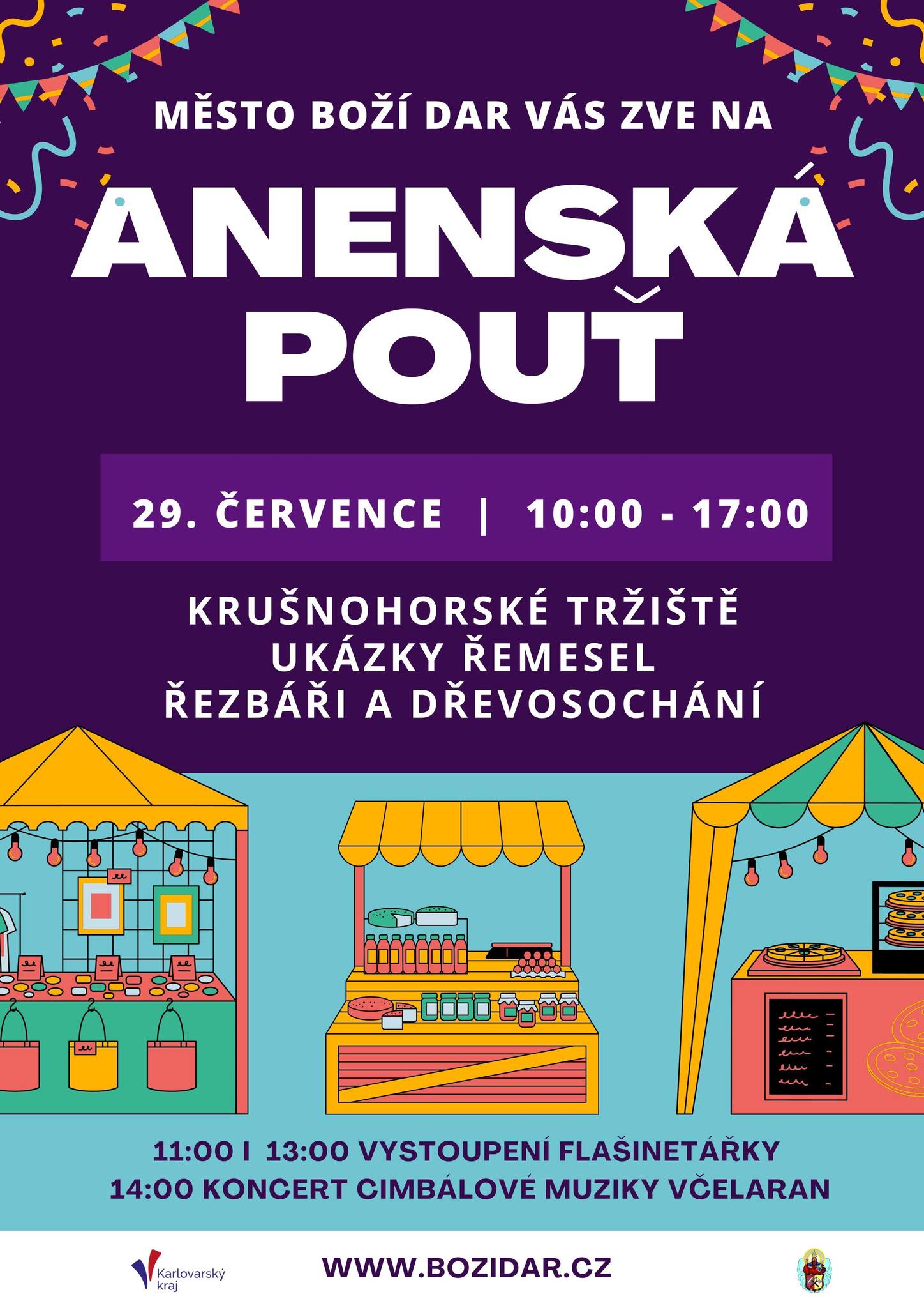 Letos to bude přímo na svátek světice, které je zasvěcen božídarský kostel. Od 10 hodin po celý den si bude možné zakoupit originální výrobky, ochutnat domácí dobroty a regionální piva, relaxovat při masáži či u kadeřnice, nechat se vyfotit ve fotokoutku, vyrýžovat valoun zlata, vystřelit si růži, zabavit děti i sebe výrobou drobností v mnoha dílničkách nebo, jak už je na Anenské pouti zvykem, svézt se na ručně poháněném kolotoči.